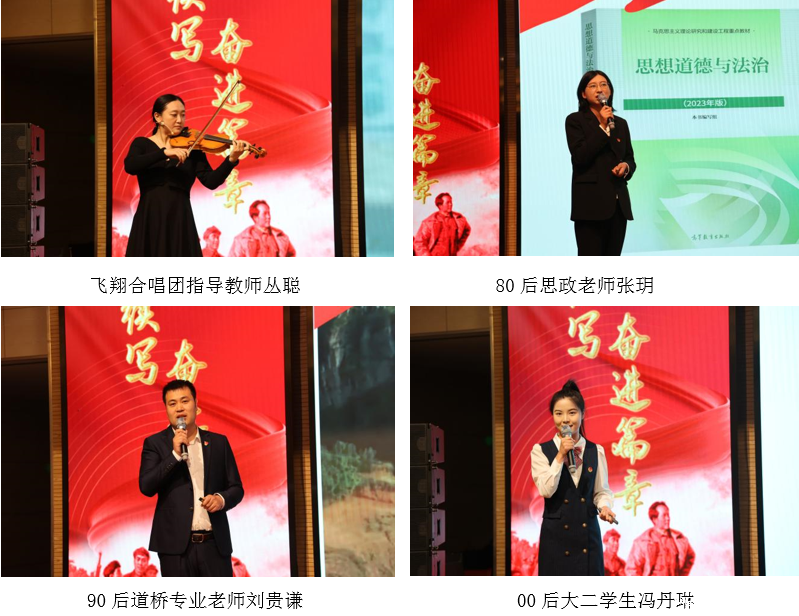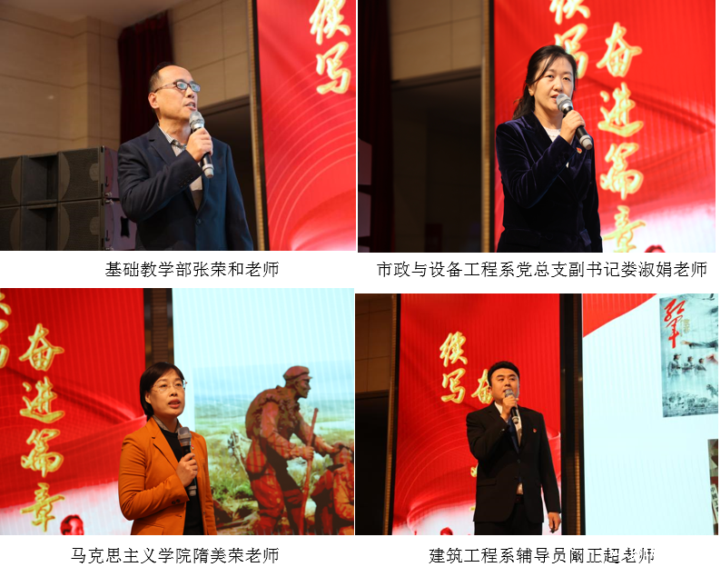 学院党委副书记高绍远宣布党课开始。在飞翔合唱团《四渡赤水出奇兵》的歌声中师生们走进那段两万五千里的浩翰史诗,在张荣和老师对《七律•长征》赏析里感受革命的浪漫主义和英雄主义,并随着市政与设备工程系党总支副书记娄淑娟的真情讲述——《重走长征路》,让大家真正体会到:什么是长征!一段波澜壮阔、刻骨铭心的岁月,一种穿越历史、辉映未来的精神,从隋美荣老师讲述的长征路上浸满血迹的感人故事、从阚正超老师列举的令人震撼的两组数据,大家读懂了什么是长征的精神和价值:是“人”的胜利,是共产主义、理想主义和英雄主义成就的胜利!丛聪老师的小提琴独奏《如愿》,流淌着“愿这盛世繁华如你所愿”的追思和“愿你所愿的永远”的深情!正是有了无数人的前仆后继,才有了今天的山河无恙、明月清风。当历史步入新时代的时候,80后思政教师张玥、90后道桥专业教师刘贵谦和00后的大二学生冯丹琳以《奋斗》《责任》《担当》给出了他们铿锵有力的答案!