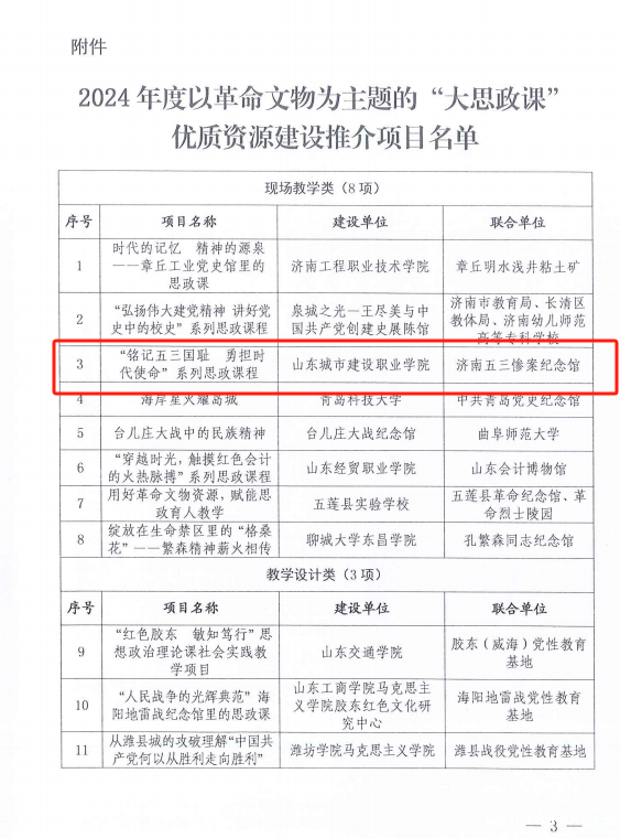 近日,山东省文化和旅游厅、省教育厅联合公布了2024年度以革命文物为主题的“大思政课”优质资源建设推介项目名单,全省共确定20个项目入选,其中,我校马克思主义学院联合济南五三惨案纪念馆申报的“铭记五三国耻 勇担时代使命”系列思政课程成功入选现场教学类项目。