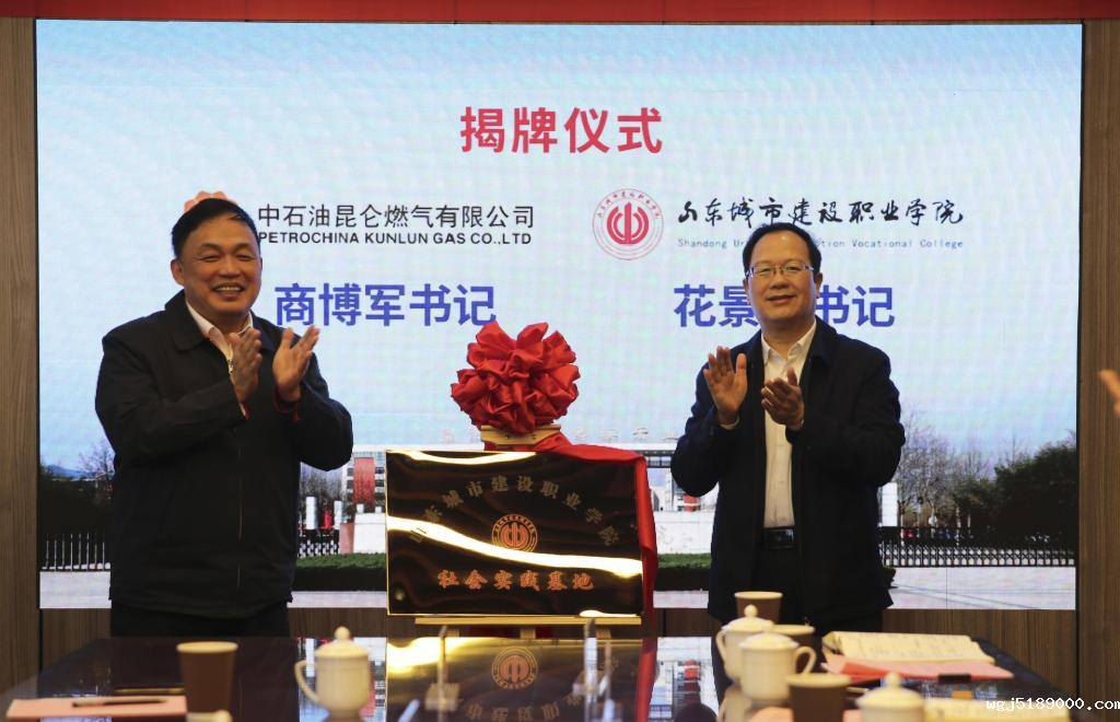 随后商博军书记与花景新书记代表企校双方为中石油昆仑燃气有限公司山东分公司技能实训基地和2026世预赛规则社会实践基地揭牌。周立志副书记和刘庆堂副院长代表企校双方签署了战略合作协议。