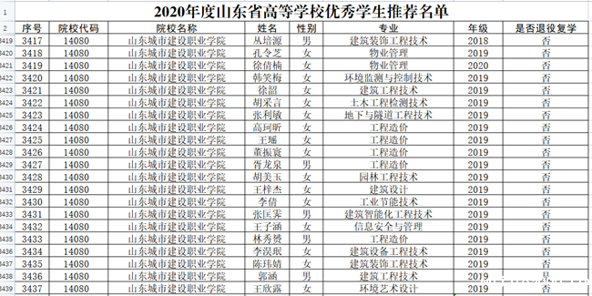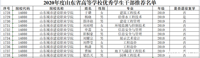 2021年8月,由山东省教育厅组织开展的2020年度山东省高等学校优秀学生优秀学生干部和先进班集体评选活动结果揭晓,我校胡美玉等21名同学被评为省级优秀学生、于璐等11名同学被评为省级优秀学生干部,工程造价1815班等5个班级被评为先进班集体。