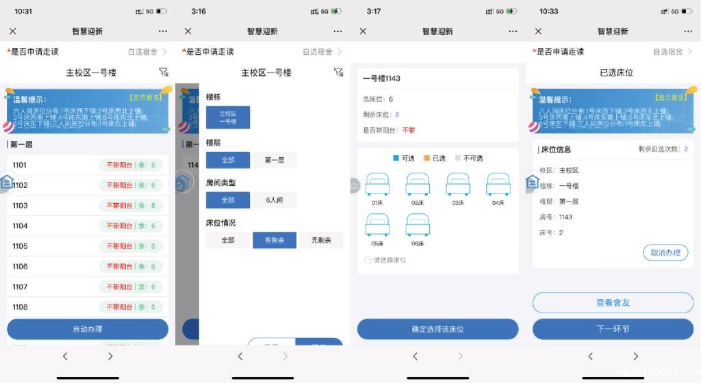 该环节面向全体新生。请点选“自选宿舍”,在预分到班的宿舍中,依次选择宿舍号和床位(东南上、东北上、西南上、西北上、东下、西下),点击[确认选择该床位],选择床位后如需调整,请点击取消办理,即可重新选择床位,每人自选宿舍次数为3次,超过3次,则无法重新调整宿舍。然后点击[下一环节]。如申请走读,需家庭所在地为济南市历城区彩石街道或距学校5公里范围内,点选“申请走读”,线下正式报到时向辅导员提交走读手续报批。