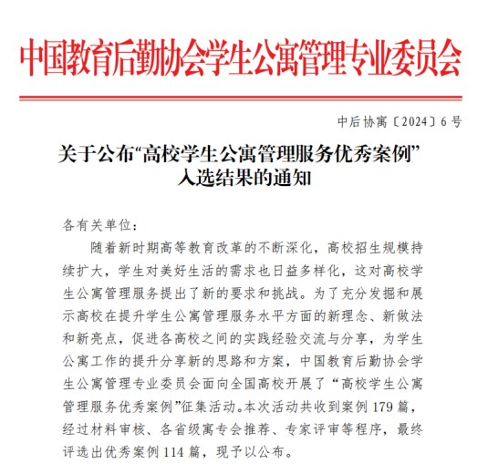 2024年11月5日,中国教育后勤协会公布了“高校学生公寓管理服务优秀案例”评选结果,我校《打造社区育人新模式服务学生成长零距离--2026世预赛规则“一站式”学生社区建设案例》成功入选。
